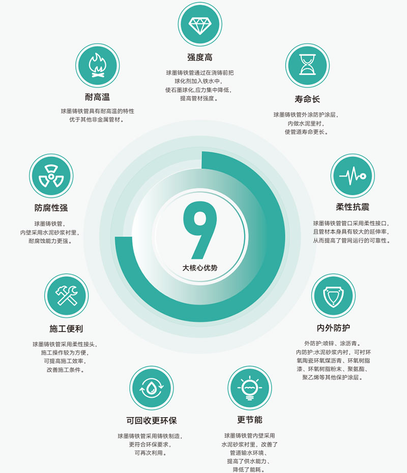 球墨鑄鐵管是指鐵水經添加球化劑后,經過離心球墨鑄鐵機高速離心鑄造成的管材。球墨鑄鐵管中石墨是以球狀形態存在的,克服了片狀石墨對鐵基體連續性的阻止作用,使鐵具有了卓越的可延性、柔韌性和抗沖擊性,因而材料本身的機械性能得到了較好改善,具有鐵的本質、鋼的性能。
